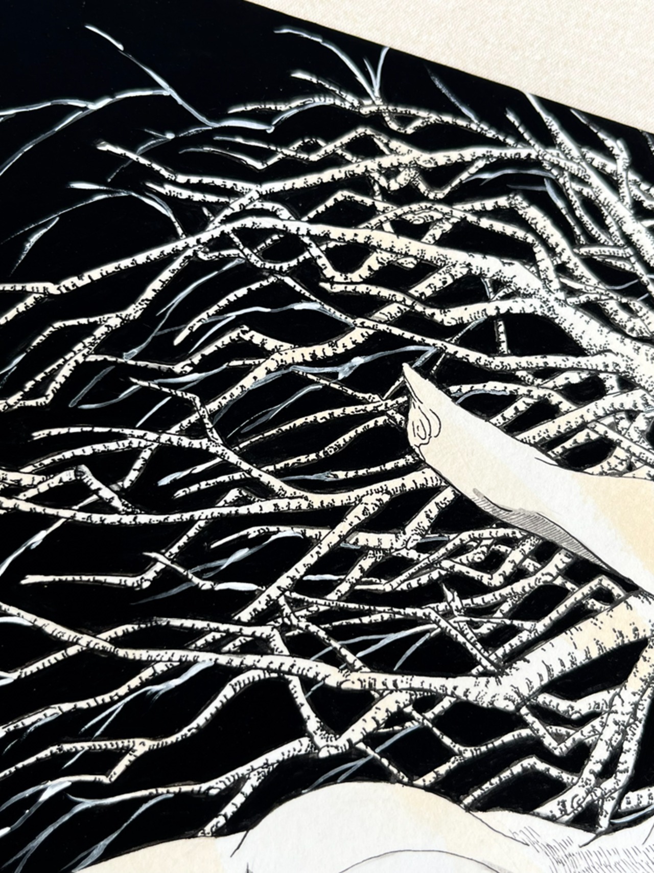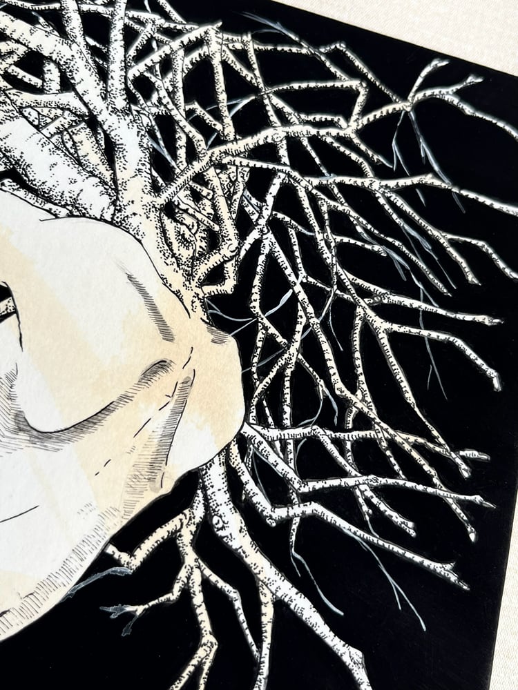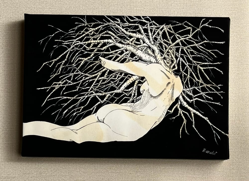ペン画を描いていた頃は心に重く〈孤独感〉が棲んでいて、何処にいても孤立感を抱えている日々でした。とある、台風の過ぎた日になぎ倒された木を見て「自分のようだ」と感じる事があり〈木霊〉木々と人間が融合した作品が生まれました。